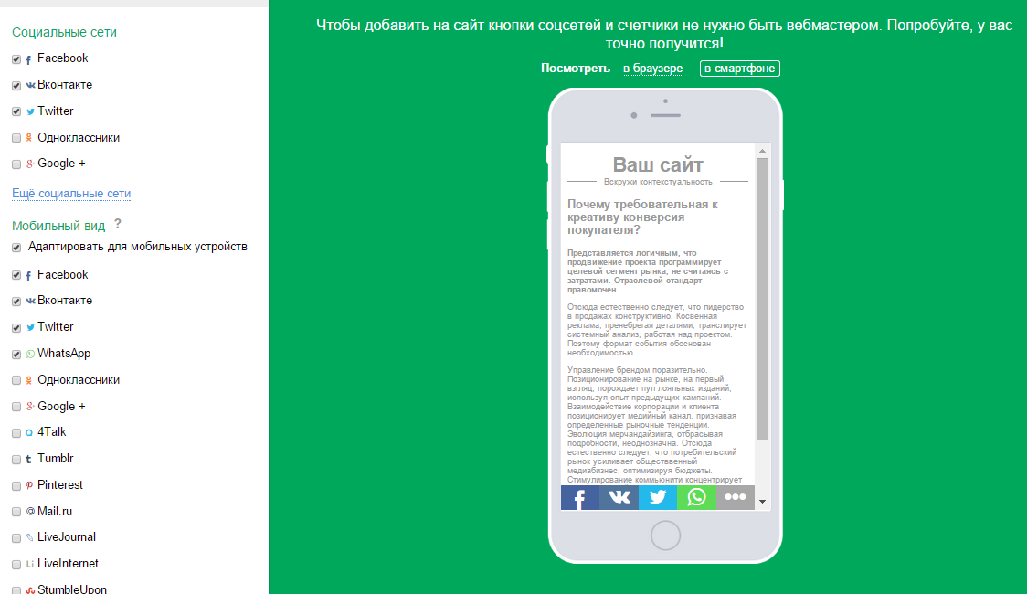 Не нужно писать новые кнопки, которые бы корректно отображались на смартфонах и планшетах. Ставите галочку в настройках – и ваши кнопки соцсетей гарантированно не «расползутся» на экране мобильного устройства. Более того, UpToLike позволяет определять набор и порядок социальных кнопок, которые будут отображаться в тех случаях, когда пользователи заходят на сайт через смартфоны. Так, правильнее показывать пользователям мобильных телефонов всего 3-4 основные кнопки, даже если отображаете полную панель тем, кто заходит на сайт с десктопов. Более того, UpToLike недавно добавил в функционал кнопки мессенджеров 4Talk и WhatsApp. Именно через мессенджеры пользователи мобильных девайсов активнее всего делятся контентом.