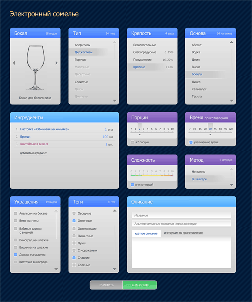 Выбор коктейля начинается с выбора бокала. От него зависят пункты меню в разделах «Тип», «Крепость», «Основа», как видим, часть из них становится неактивными в определенных случаях.