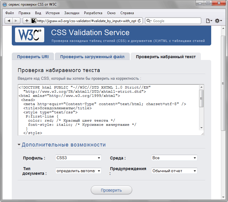 Последняя вкладка предназначена для непосредственного ввода HTML или CSS-кода, при этом проверке будет подвергнут только стиль (рис. 20.3).
